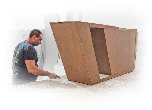 Budujemy poszczególne elementy stoiska: lady, szafy, biurka – wszystko zgodnie z projektem.